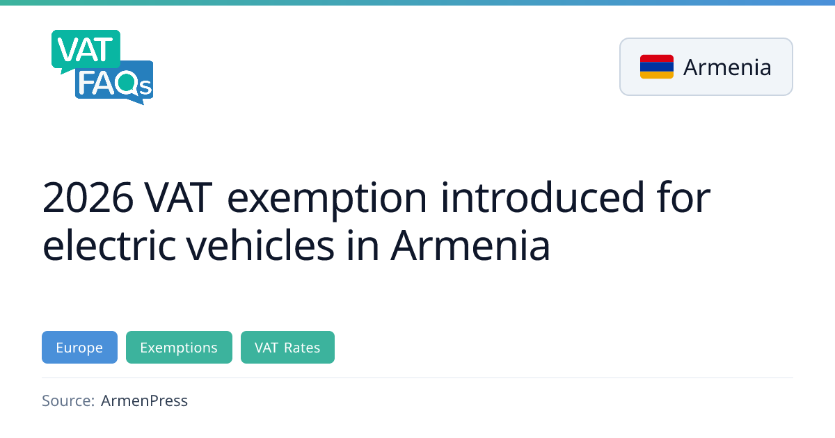 Armenia has introduced a VAT exemption for electric vehicles effective from 1 January 2026. The exemption covers specific HS codes for the first month of the year and then applies only to vehicles manufactured after 31 December 2023 for the remainder of 2026. The change follows legislative amendments made on 17 December 2025.