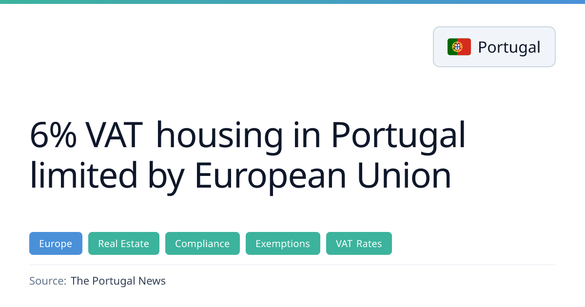 Portugal has introduced a 6% VAT rate for the construction of homes intended for sale or rent at moderate prices, but the measure is restricted by EU regulations to owner‑occupied homes up to €684,000 and rentals up to €2,300 per month. The new law, published on 6 March 2026, gives the government 180 days to approve the relief, and accompanying decrees also lower income tax for rentals, exempt capital gains on reinvested profits, and impose a 7.5% transfer tax on non‑resident buyers.