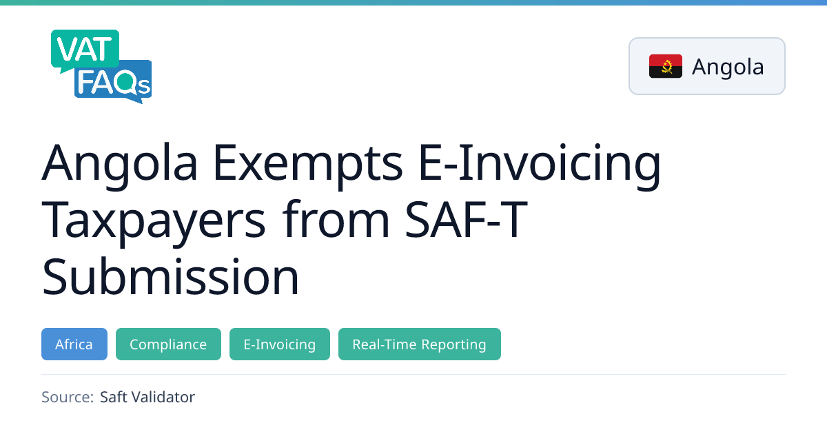 On 20 March 2026 Angola’s AGT exempted taxpayers who issue electronic invoices from the obligation to submit SAF‑T files, simplifying compliance for those already on the e‑invoicing system. The exemption covers large taxpayers, government suppliers and, from 1 October 2026, all remaining VAT‑regime taxpayers, while accounting and inventory SAF‑T obligations remain unchanged.
