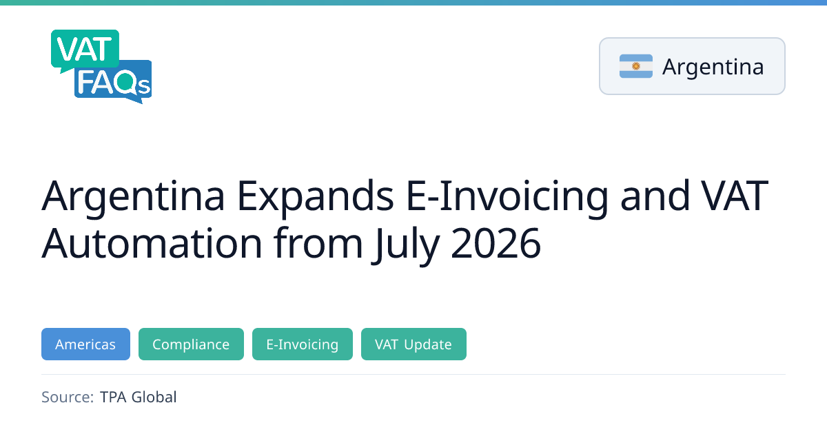 Argentina’s tax authority ARCA has introduced General Resolution 5824/26, expanding mandatory e‑invoicing to new sectors and launching a monthly electronic settlement system effective 1 July 2026. The resolution also provides pre‑filled VAT returns for Simplified Tax Regime taxpayers, with invoicing data automatically populating annual returns. Electronic invoices will be available via ARCA’s “My Receipts” portal and integrated into the Digital VAT Ledger.