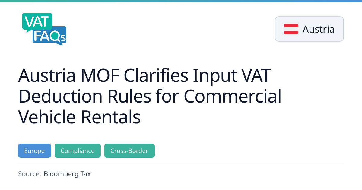 The Austrian Federal Ministry of Finance clarified the input VAT deduction rules for commercial vehicle leasing in a Federal Finance Court decision. The ruling states that input VAT can only be deducted when the rental activity is a clear, objectively verifiable commercial operation, not merely asset management, and that leasing to related companies alone does not qualify. The decision applies to intra‑community vehicle purchases and impacts companies claiming VAT on passenger cars used for group leasing.