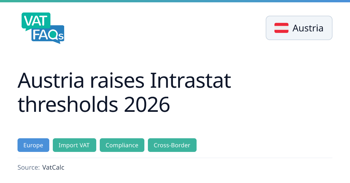 Austria has increased its Intrastat reporting thresholds for 2026. From 1 January 2026, the arrivals threshold rises to €5 million per annum and the dispatch threshold to €1.2 million per annum. Statistical thresholds remain at €12 million for both arrivals and dispatches.