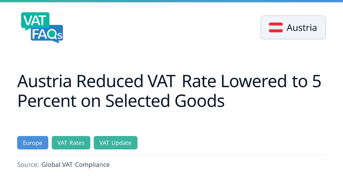 Austria has lowered its reduced VAT rate from 10% to 5% for a defined basket of goods, effective 1 July 2026. The change applies only to specified goods and does not affect the standard rate.