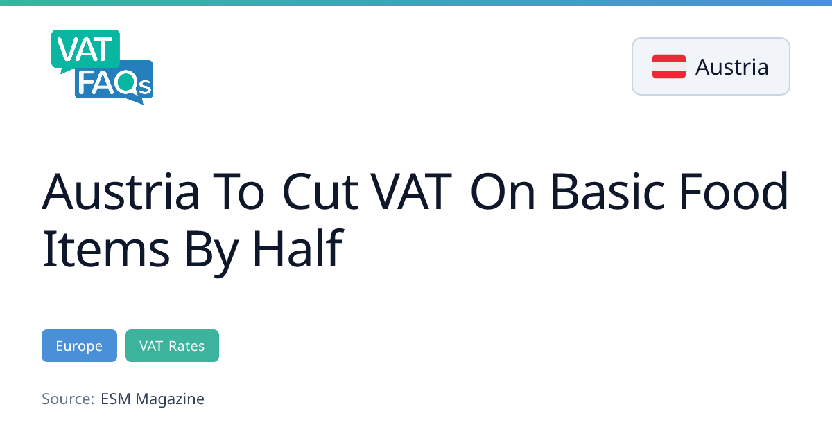 The Austrian government announced that it will halve the VAT rate on essential food items as part of its fiscal policy. The change is expected to provide relief to consumers on basic groceries. No further details on the effective date or specific rates were disclosed in the article.