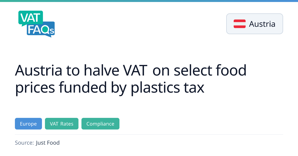 The Austrian government announced that it will halve the VAT rate on essential food items as part of its fiscal policy. The change is expected to provide relief to consumers on basic groceries. No further details on the effective date or specific rates were disclosed in the article.