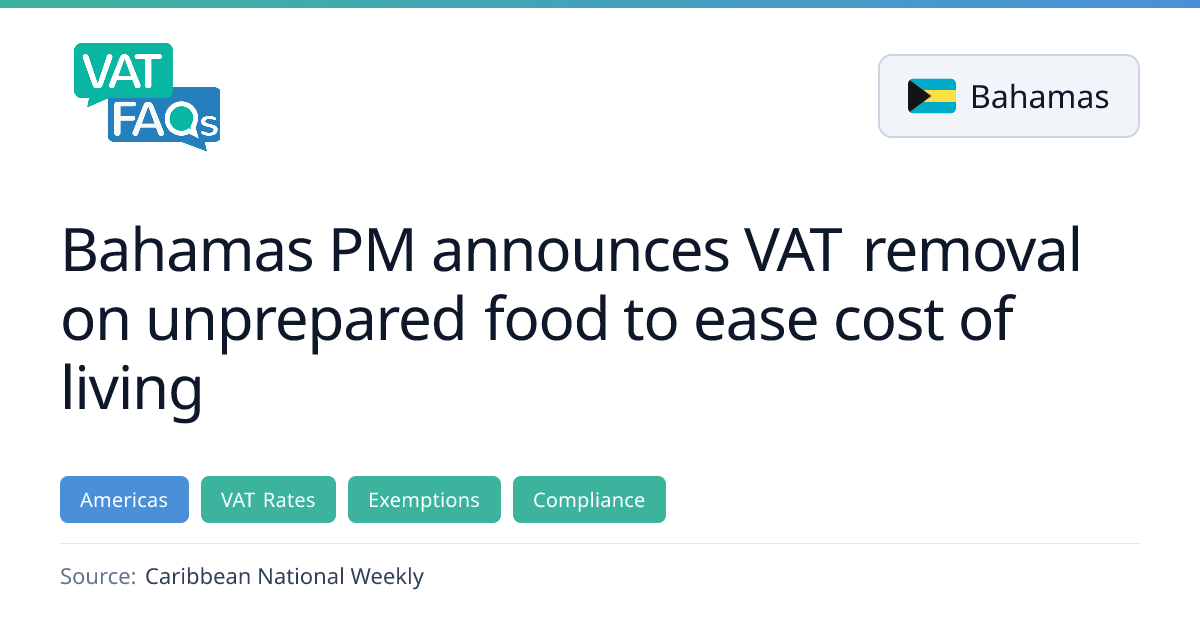 The Bahamas Prime Minister announced that VAT on unprepared food will be removed, effective 1 April 2026, bringing the rate to 0%. The announcement also includes a reduction of the overall VAT rate from 12% to 10%, aiming to ease the cost of living for Bahamian households.