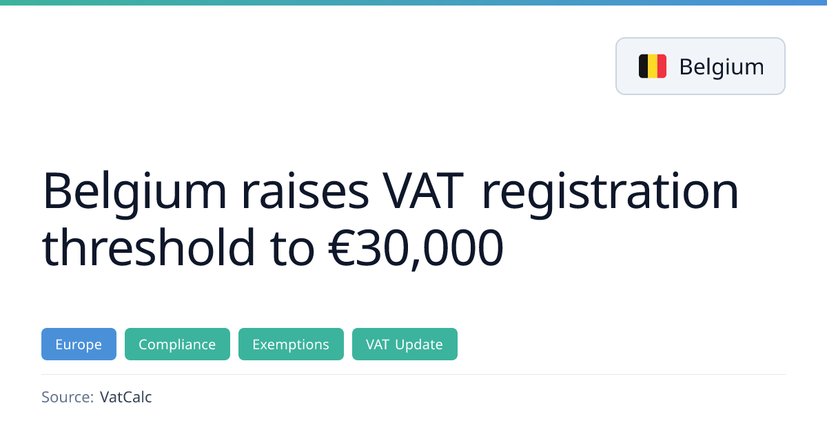Belgium has increased the annual turnover threshold for its domestic VAT exemption regime from €25,000 to €30,000, pending parliamentary approval. Businesses below the new €30,000 limit may still register voluntarily, while those exceeding it must register and comply with VAT obligations. The exemption still prevents input VAT recovery and removes periodic return filing.