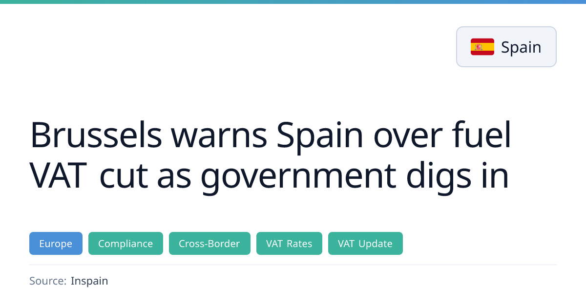 Spain has temporarily lowered fuel VAT from 21% to 10% under Real Decreto-ley 7/2026, a measure set to expire on 30 June 2026. The EU Commission warned that the cut breaches EU rules, but no formal infringement has been initiated. The temporary relief is expected to cost Spain about €507 million in revenue loss.
