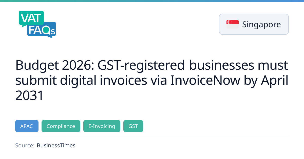 Singapore’s 2026 budget introduces a requirement for all GST‑registered businesses to submit digital invoices via the InvoiceNow e‑invoicing network by April 2031. The government will roll out free InvoiceNow‑Ready software and cash grants up to S$5,000 to support the transition, prioritising smaller firms. Since Nov 1 2025, newly incorporated GST‑registered companies have already been required to transmit invoice data through InvoiceNow.