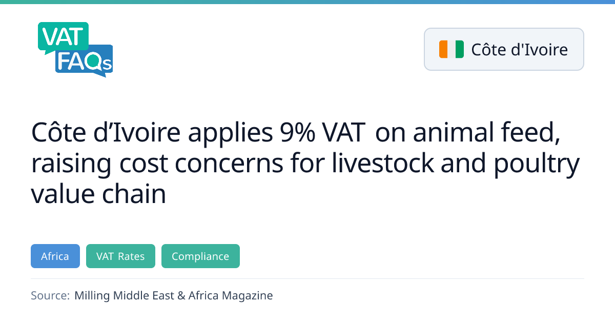 Côte d’Ivoire has introduced a 9% value‑added tax on animal feed, production inputs and related packaging, effective 17 January 2026. The measure replaces a previous exemption that applied until the end of 2025 and is part of the 2026 Finance Law tax reform. The reduced rate, chosen over the standard 18%, aims to limit the impact on the livestock sector while still bringing these goods into the VAT framework.