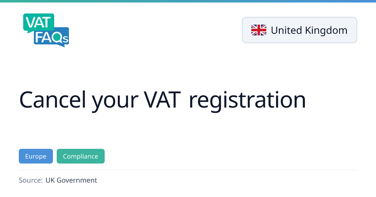 The UK guidance explains how to cancel a VAT registration, either online or by post, using form VAT 7 for individual businesses and form VAT 50‑51 for VAT groups. It advises that businesses should not cancel immediately after an insolvency practitioner’s appointment if asset sales are pending, as VAT on those sales must still be reported. The guidance references Notice 700/11 for further details.