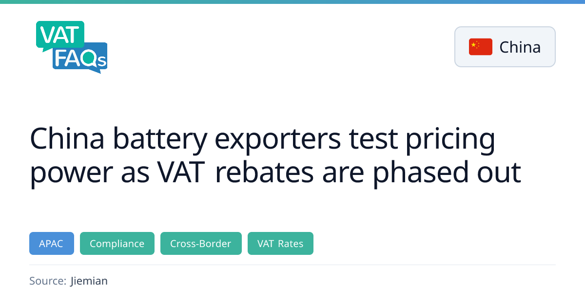 China's Ministry of Finance announced a phased rollback of VAT export rebates for battery products, cutting the rebate from 9% to 6% from April 2026 to December 2026 and eliminating it entirely from January 2027. Photovoltaic product rebates will also be scrapped from April 2026. The move is expected to squeeze margins for exporters unless they can pass costs to overseas buyers, with industry experts forecasting gradual price increases of 2–3% for power batteries and 2–4% for energy storage batteries.