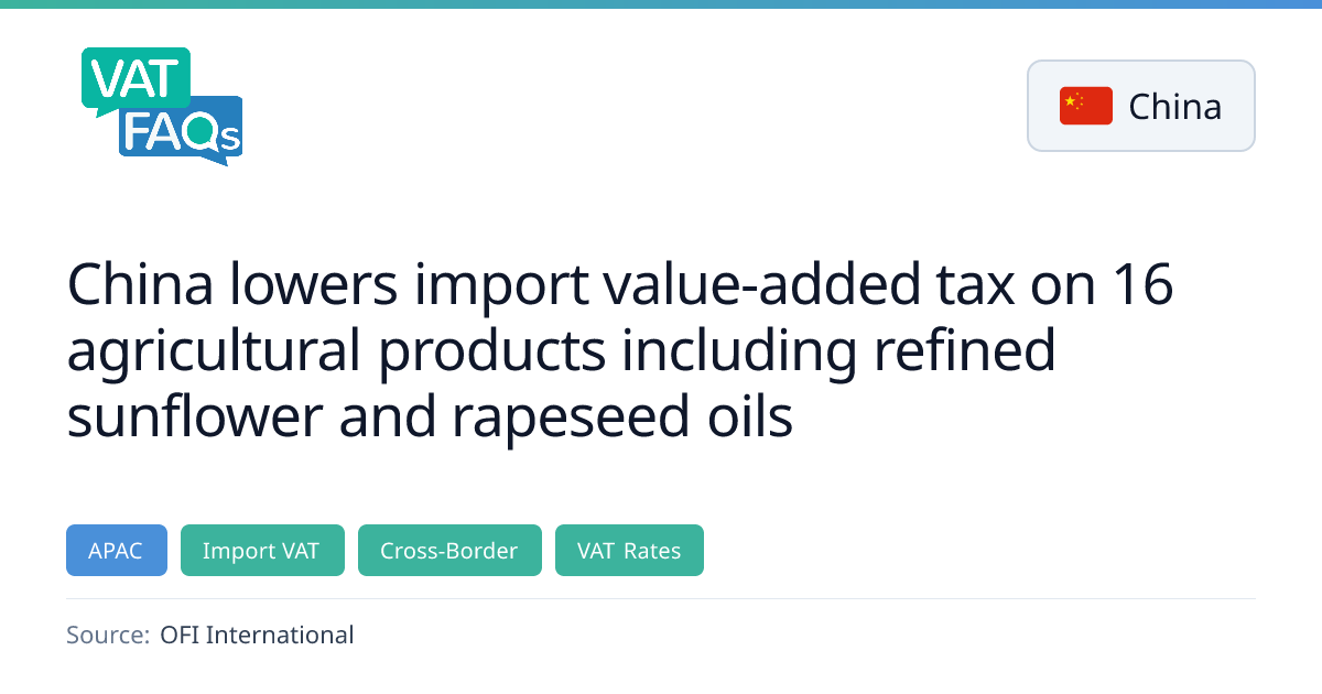 China has lowered the import VAT on 16 agricultural products, including refined sunflower and rapeseed oils, from 13% to 9% effective 2 February 2026. A new tariff line 1512190010 was created for refined sunflower oil, and the change applies to a range of oils and fats. Products imported from the USA remain subject to retaliatory MFN tariffs.