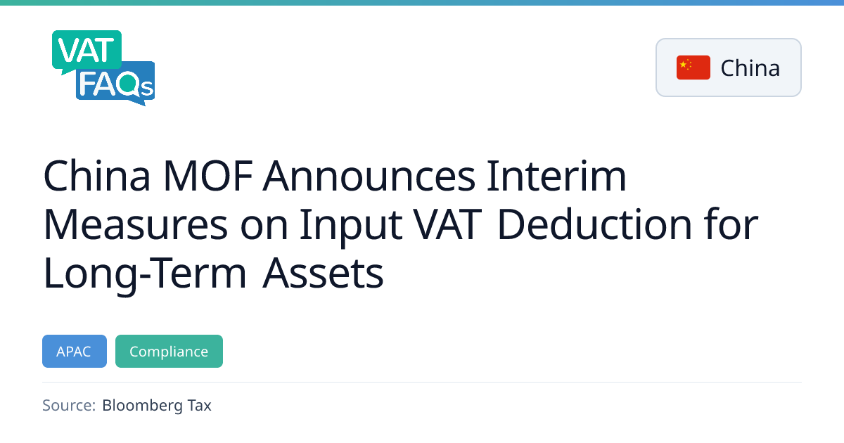 The Chinese Ministry of Finance issued Announcement No. 15/2026 on Feb 2 2026, outlining interim measures for input VAT deductions on long‑term assets. The measures clarify the scope of long‑term fixed assets, set a 5 million‑yuan threshold for mixed‑use assets, and define the adjustment period for deduction. These rules apply to assets acquired from Jan 1 2026 or recognized before Dec 31 2025.