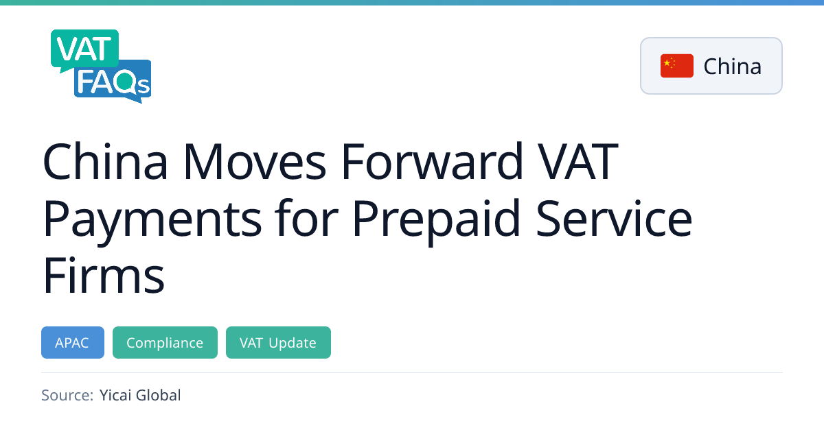 Chinese authorities have advanced the timing of VAT payments for firms that collect money before delivering services, requiring tax on the full amount received earlier. The change may push businesses over the CNY5 million threshold, forcing a switch to general VAT taxpayer status.