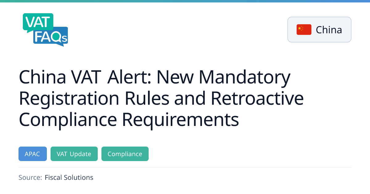 China’s State Taxation Administration announced new mandatory VAT registration rules effective 1 January 2026, requiring businesses with annual taxable sales above RMB 5 million to register as general VAT taxpayers. The announcement introduces retroactive compliance, mandatory registration for specific sectors, and automatic reclassification for late registrants, increasing compliance risk for businesses near the threshold.