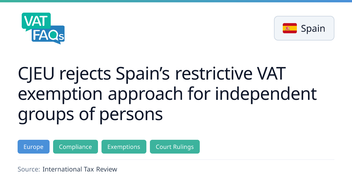 The Court of Justice of the European Union (CJEU) ruled that Spain cannot impose a stricter “directly and exclusively” requirement on VAT exemptions for services supplied by independent groups of persons. The decision clarifies that services must be directly necessary for the exempt activity, but exclusivity is not required, allowing general services such as cleaning to qualify. The ruling also states that competition distortion must be assessed on a concrete basis, not presumed.