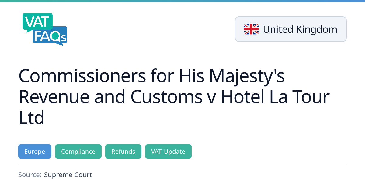 The UK Supreme Court is hearing a case on whether Hotel La Tour Ltd can recover the VAT paid on professional fees incurred to facilitate the sale of shares in its subsidiary. The dispute centers on the link between the input VAT and the company’s taxable activities. The judgment, issued 17 December 2025, will clarify the recoverability of such VAT in similar share‑sale contexts.