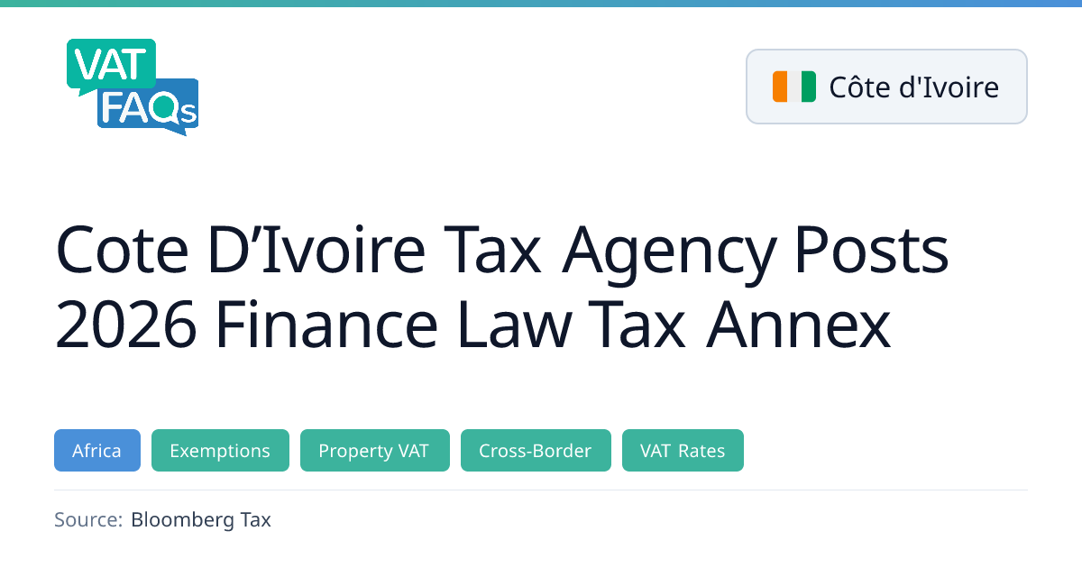 The Ivorian tax authority released the annex to the 2026 Finance Law, introducing several tax changes. Measures include extending a 7.5% withholding tax on non‑commercial profits for certain non‑salaried participants, eliminating VAT exemptions for oil exploration, agriculture, manufacturing and packaging and applying the standard 18% VAT rate, raising the tourism development tax to 2.5% from 1.5%, imposing a tax on foreign digital service platforms without a physical presence, and reducing the property tax to 13% from 15%.
