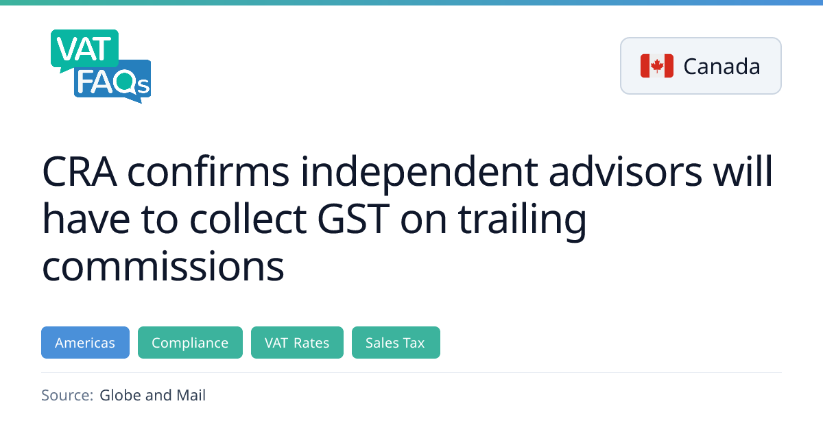 Canada Revenue Agency has confirmed that independent financial advisors will now need to collect and remit GST/HST on trailing commissions from mutual fund dealers, effective July 1, 2026. The rule applies to advisors whose taxable revenue from trailing commissions exceeds $30,000, while dealer employees remain exempt. The CRA’s notice clarifies that trailing commissions are no longer considered financial services for GST purposes.