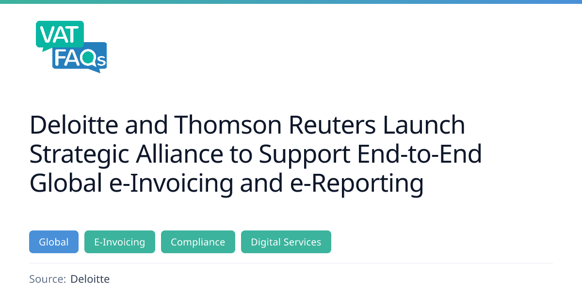 Deloitte and Thomson Reuters announced a strategic alliance on 21 January 2026 to provide managed e‑invoicing and e‑reporting services worldwide, leveraging Thomson Reuters ONESOURCE Pagero. The partnership offers global coverage across more than 80 jurisdictions, aiming to reduce compliance risk, improve operational efficiency, and deliver data‑driven insights for indirect tax compliance.