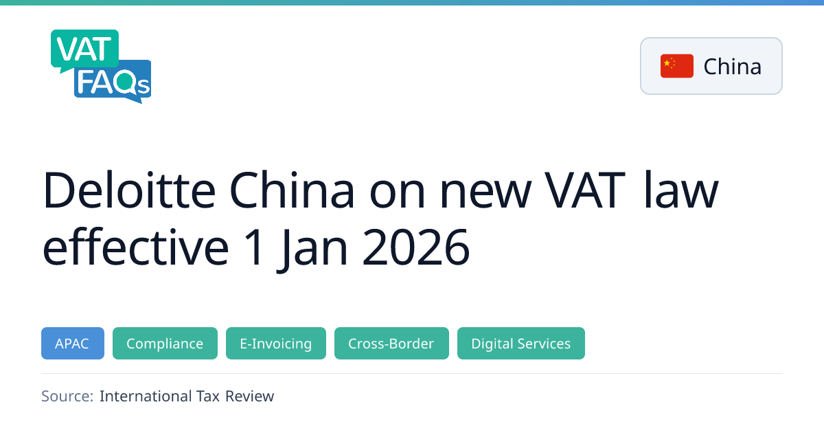 Deloitte China outlines the impact of its new VAT law effective 1 Jan 2026, highlighting key changes such as cross‑border supply rules, deemed sales, mixed sales, input‑VAT recovery rights, and mandatory e‑invoicing. The firm advises businesses to evaluate compliance and strategic implications, while noting forthcoming preferential policies and potential registration options for foreign entities.
