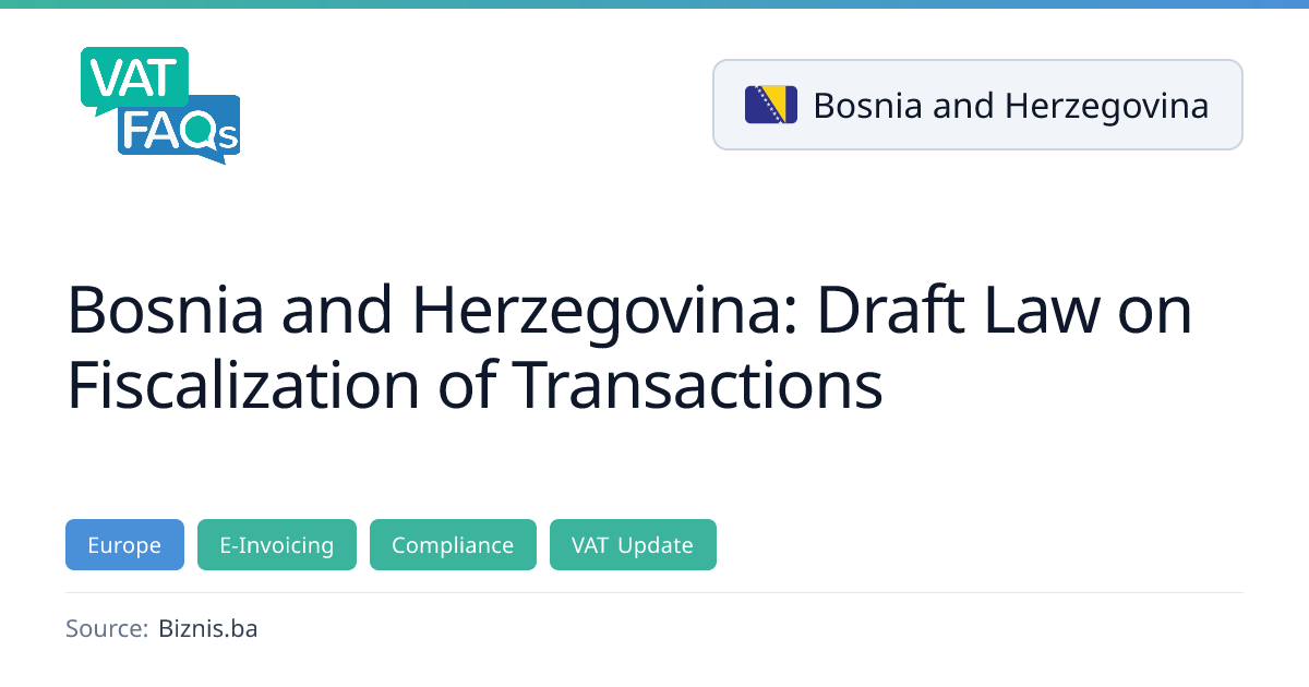 The Federation of Bosnia and Herzegovina has approved a bill that would make B2B and B2G e-invoicing mandatory via a Central Platform for Fiscalisation (CPF) and require B2C transactions to use approved Electronic Fiscal Systems (EFS). The proposal aims to align with the EU ViDA model by July 2030 and has moved from the Lower House to the upper house for final approval.