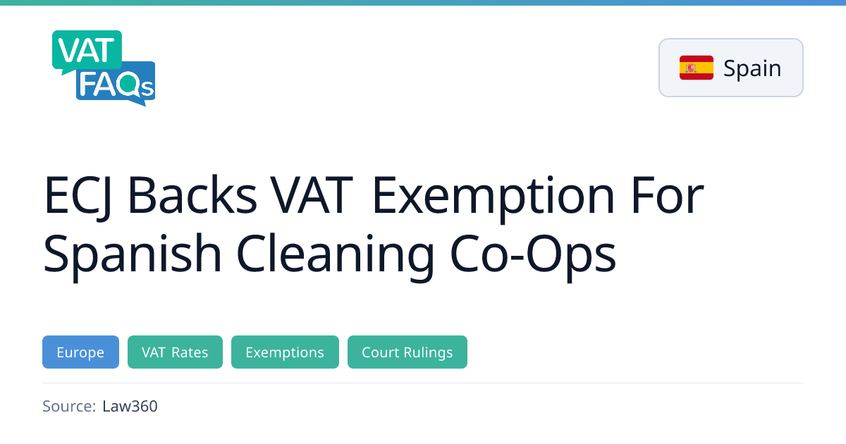 The European Court of Justice ruled that Spain cannot automatically deny cleaning cooperatives a VAT exemption for services supplied to educational and healthcare institutions. The decision confirms that such co‑ops are entitled to the exemption, preventing blanket denial by Spanish authorities. The ruling was issued on 22 January 2026.