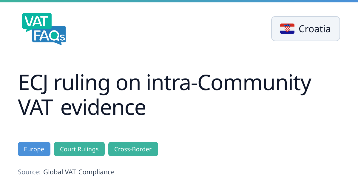 The EU Official Gazette published a preliminary ruling from the ECJ on Jan. 12, 2026, concerning Croatian VAT rules for intra‑community supplies of goods. The case involved a Croatian trading company supplying oak logs to Slovenia and claiming a VAT exemption, which was challenged for lack of documentation under Article 45a of Regulation 282/2011. The ECJ held that Directive 2006/112/EC and Regulation 282/2011 must be interpreted accordingly.