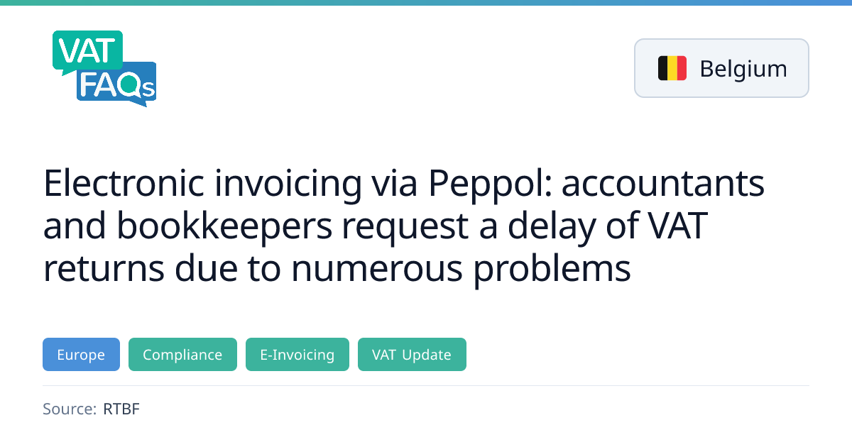Belgium has required all VAT‑registered companies to use electronic invoicing via the Peppol network since 1 January 2026. Accountants and bookkeepers, citing widespread technical problems, have asked the finance minister to postpone the 25 January VAT‑return deadline to 28 February and to waive penalties. The request highlights challenges with invoice delivery, software performance and duplicate filings.