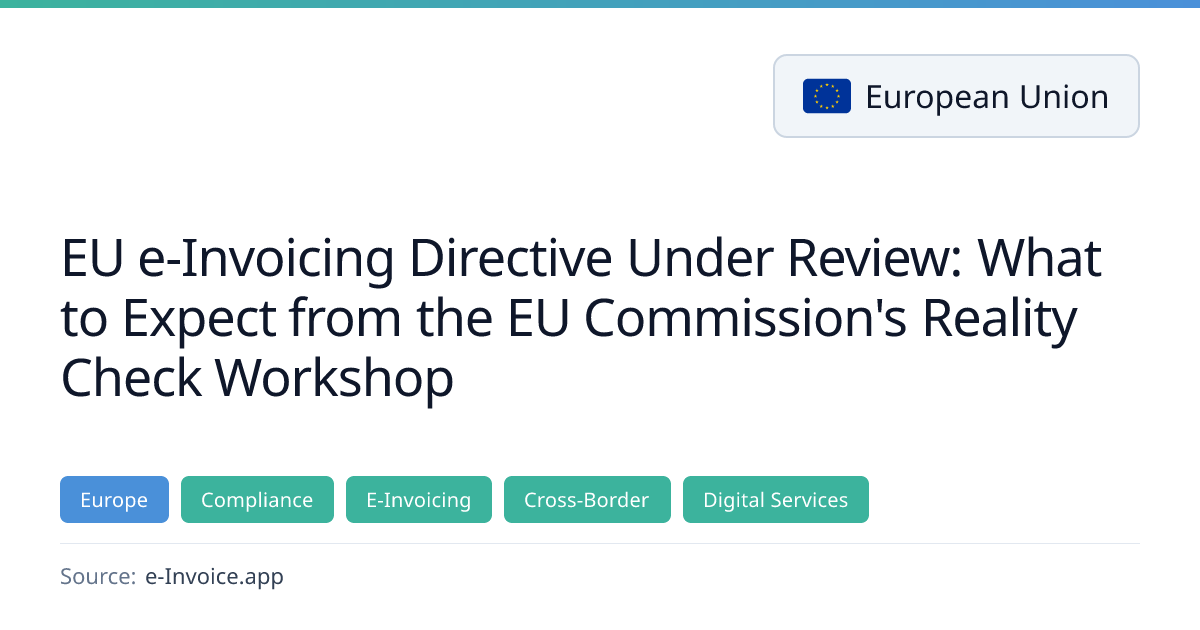 The European Commission will host a public workshop on 27 April 2026 to review the revision of Directive 2014/55/EU on e‑invoicing in public procurement. The event will outline potential policy measures, gather stakeholder feedback, and discuss the three policy options for the revision. The outcome will influence upcoming compliance requirements, including the ViDA reform that will mandate structured e‑invoicing for intra‑EU B2B transactions by July 2030.