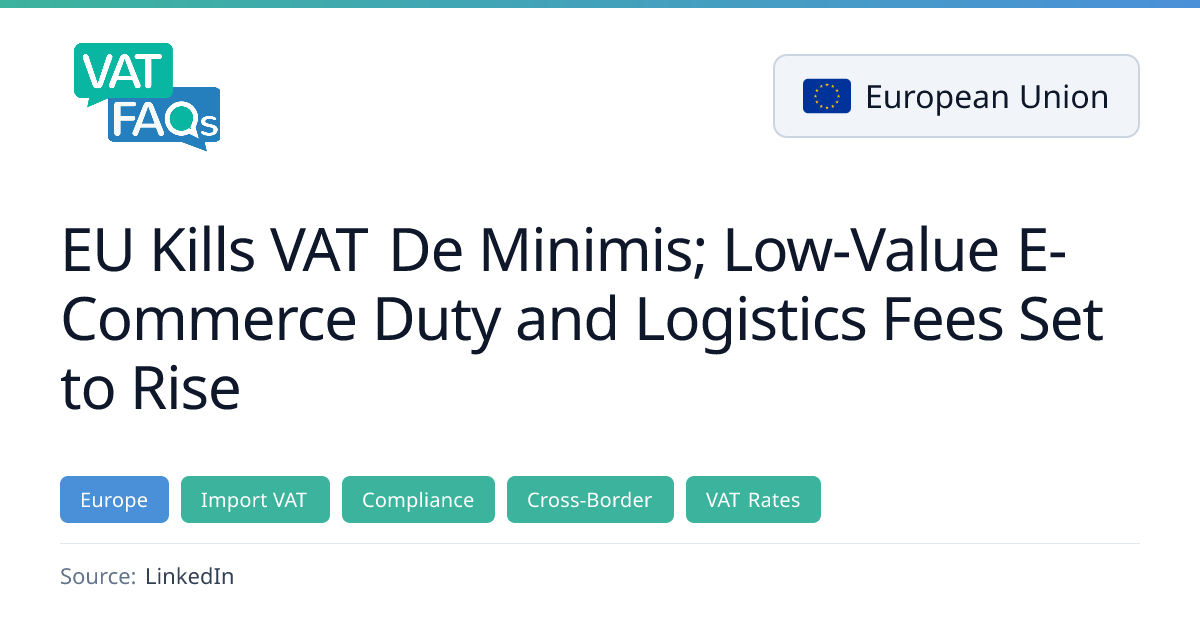 The EU has abolished the VAT de‑minimis rule, making VAT applicable to all commercial goods. Starting 1 July 2026, a €3 fixed duty per product type will apply to low‑value e‑commerce consignments, with a separate handling fee expected from late 2026 and the €150 duty‑free threshold slated to disappear by mid‑2028. Member states such as Romania have already introduced €5 logistics fees from 1 January 2026.