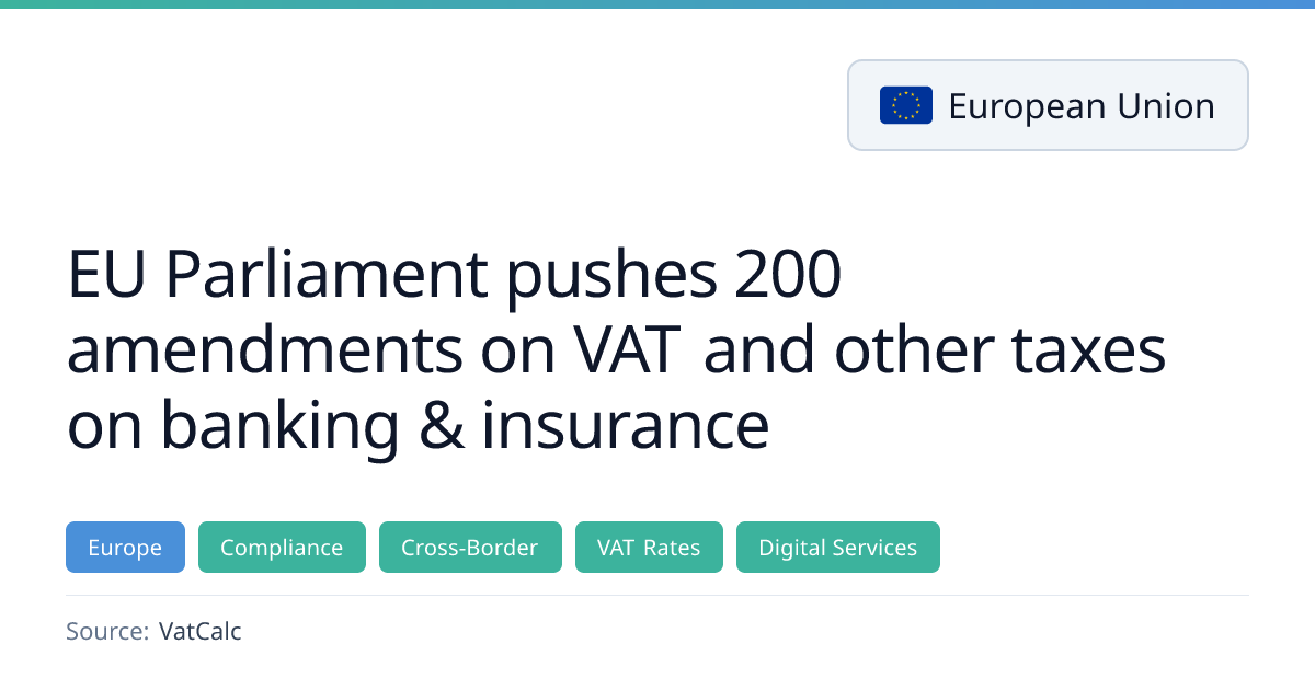 EU Parliament has tabled more than 200 amendments to its draft report on a coherent tax framework for the financial sector, with VAT reform at the centre. The proposals aim to narrow the long‑standing VAT exemption for financial services, tax fee‑based B2B services, consolidate the Insurance Premium Tax into VAT, and modernise rules for neobanks, crypto and other digital financial services. A parliamentary vote is scheduled for 26 April 2026, with a vote expected in May and potential plenary adoption in June.