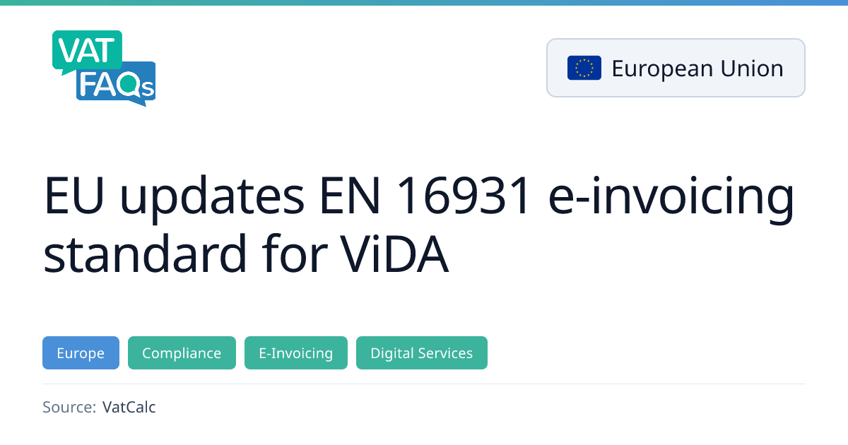 CEN approved an updated EN 16931‑1 e‑invoicing standard on 13 February 2026, adding new mandatory fields for B2B transactions and aligning with the July 2030 Digital Reporting Requirements. The revision supports both B2B and B2G use, enabling ViDA users to comply without costly system rebuilds.