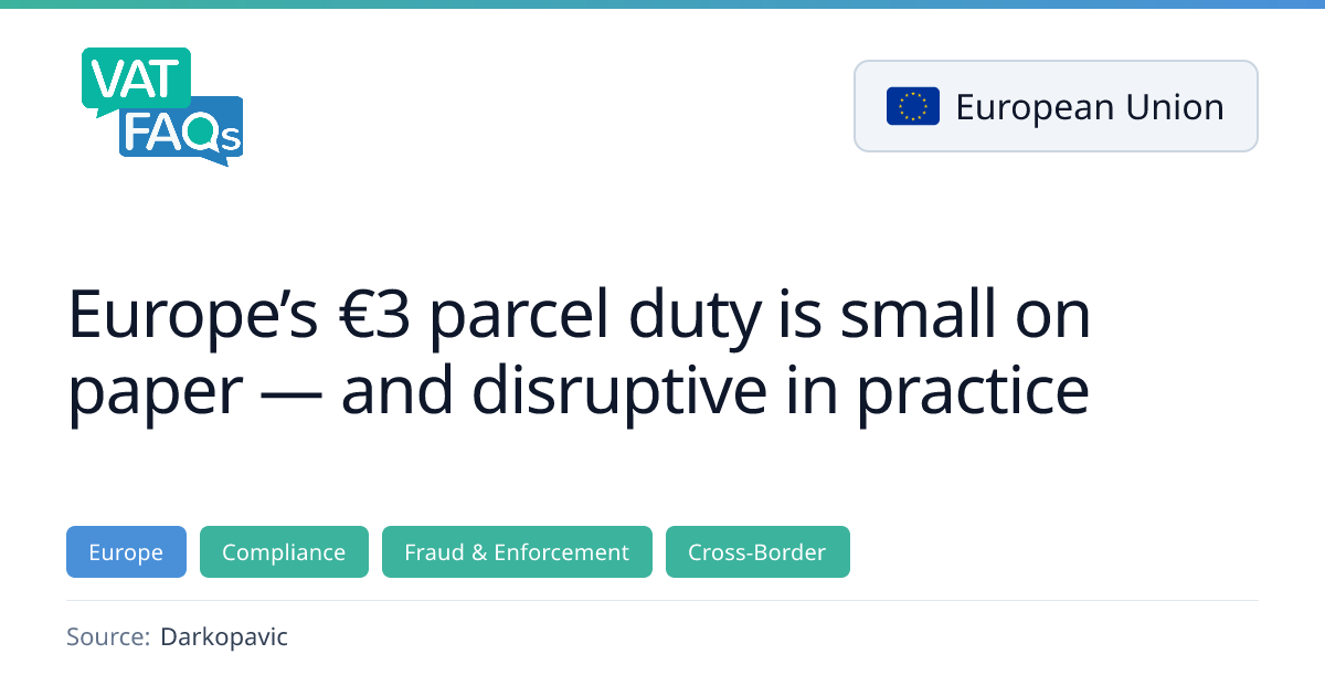 The European Union has approved a flat €3 customs duty on low‑value parcels valued below €150, effective 1 July 2026, as a temporary measure before broader customs reform in 2028. The rule applies by item type rather than per box and aims to curb unfair competition from direct‑to‑consumer imports, especially from China.