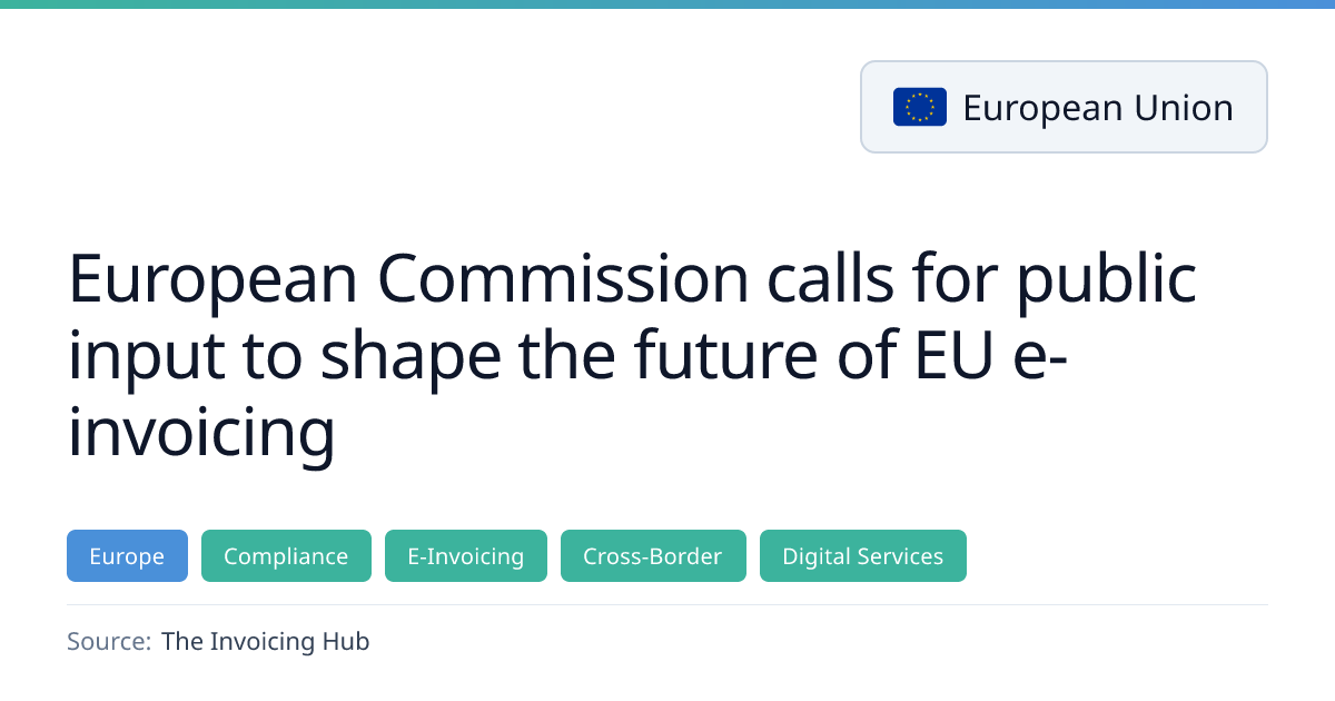 The European Commission has launched a public consultation and a "Reality Check" event to shape the upcoming revision of EU e-invoicing rules, including the e-invoicing directive and EN 16931 standard. The consultation runs until 10 June 2026, while the interactive event is scheduled for 27 April 2026. The Commission expects the revised directive to be adopted in Q4 2026 as part of the Single Market Strategy.