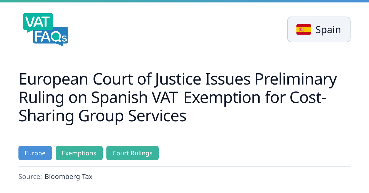 The European Court of Justice issued a preliminary ruling on Jan. 22, 2026, stating that the Spanish VAT exemption for services rendered by cost‑sharing groups to members at cost is not valid. The ruling interprets Council Directive 2006/112/EC as precluding such an exemption, as the services were deemed outsourced and not linked to tax‑exempt activities. The decision applies to services such as cleaning for healthcare and educational buildings.