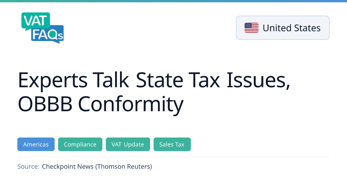 The webinar highlighted the impact of the One Big Beautiful Bill Act on state budgets, the ongoing Streamlined Sales and Use Tax Agreement, and specific sales‑tax challenges in California and Illinois. Key issues include federal conformity decisions, new California TTA rules, and Illinois’ remote‑seller amnesty and Chicago’s personal‑property lease tax adjustments.