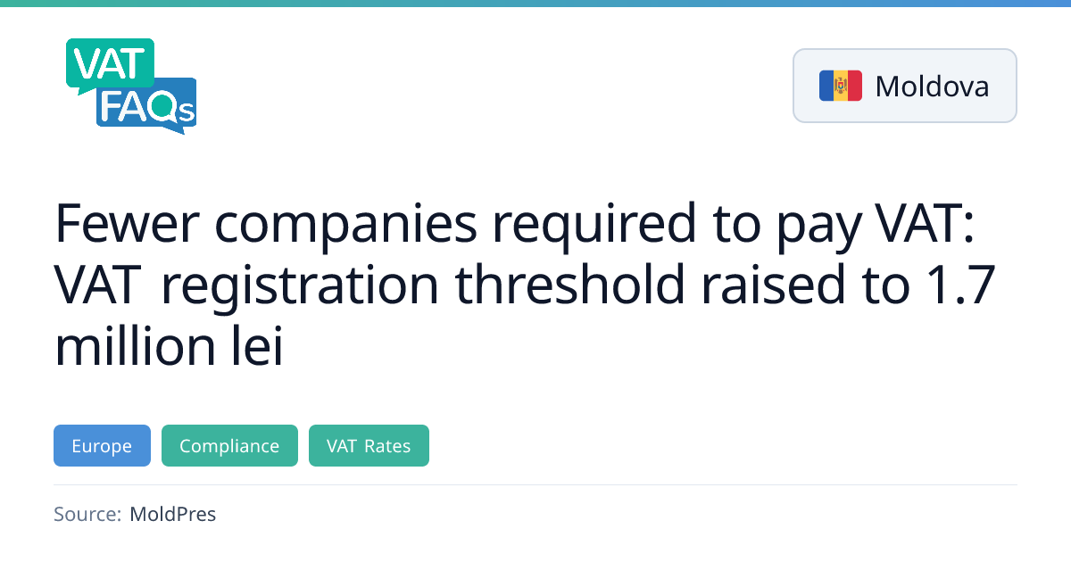 Moldova’s legislature has amended the Tax Code to raise the VAT registration threshold to 3.2 million lei, a move that the Ministry of Finance only partially supports by proposing 1.7 million lei. The current threshold, effective 1 January 2026, stands at 1.5 million lei, and the EU directive caps the limit at 85 000 € or its equivalent.
