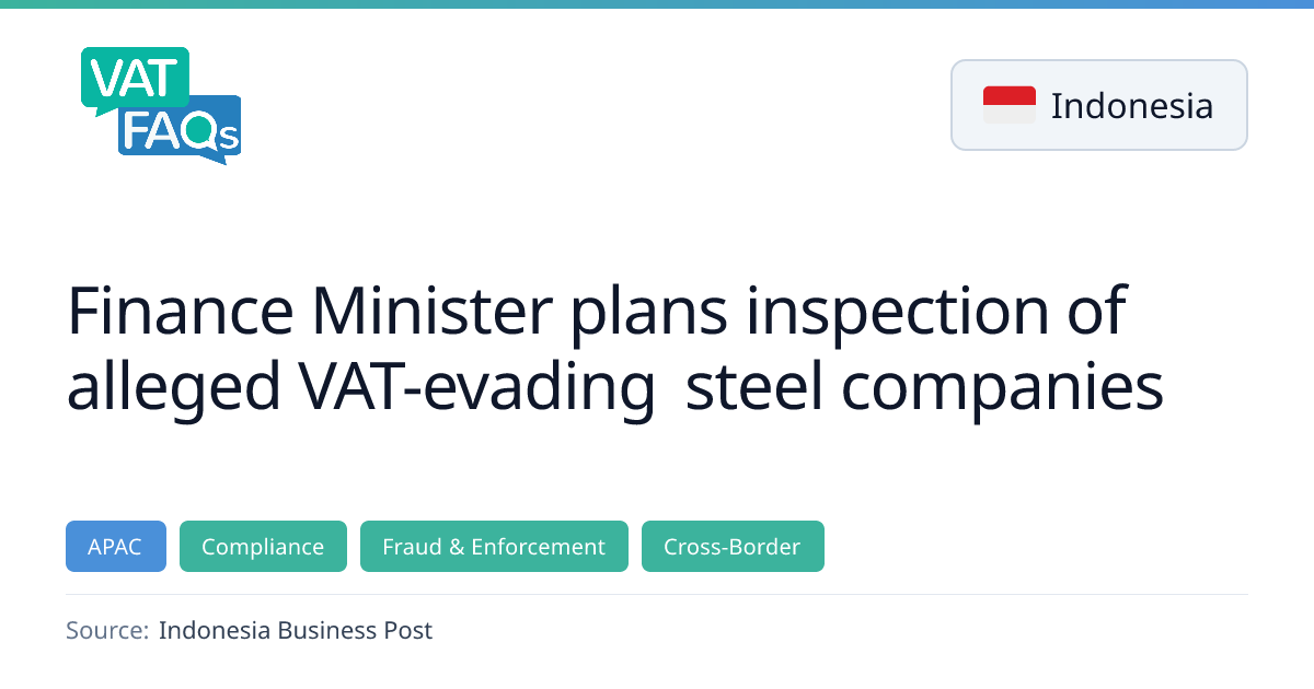 Indonesia's Finance Minister Purbaya Yudhi Sadewa announced plans to inspect a Chinese‑owned steel company suspected of VAT evasion next week. The Ministry has identified 40 steel firms, with the two largest slated for inspection, and estimates that VAT avoidance could cost the state over Rp 4 trillion annually. The investigation will involve tracing tax reports, company registrations, ownership, and detaining tax‑related personnel.