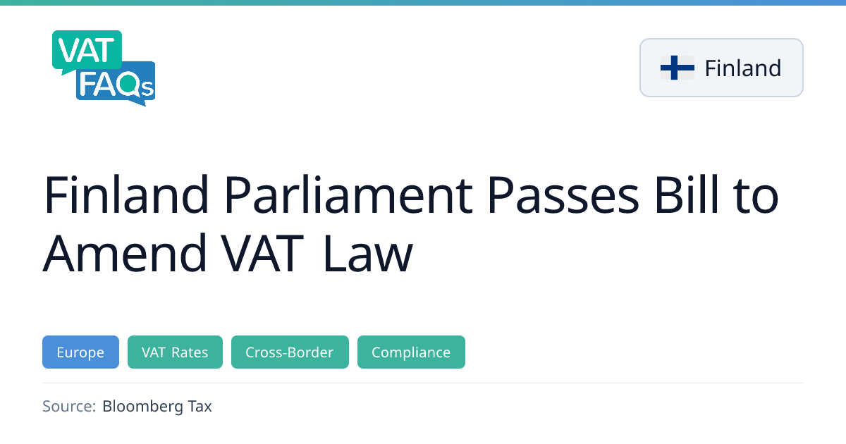 Finland’s Parliament approved a bill on 28 November 2025 that introduces a 13.5% VAT rate on specified services, goods, and imports of collectibles and antiques. The new rate and related provisions take effect on 20 December 2025, covering all tax obligations from that date, including intra‑community acquisitions. The legislation will enter into force on the same day.