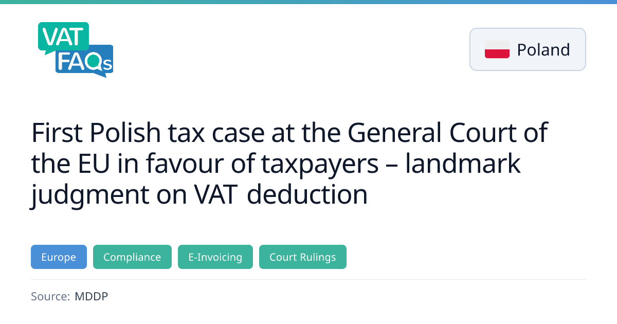 The General Court ruled that Poland’s requirement of invoice possession for VAT deduction is incompatible with EU law. Polish taxpayers can now deduct VAT in the month of liability if the invoice was issued before the tax return submission, rather than waiting for the next accounting period. The decision is expected to accelerate VAT recovery and improve cash flow, especially under the mandatory KSeF e‑invoicing system.