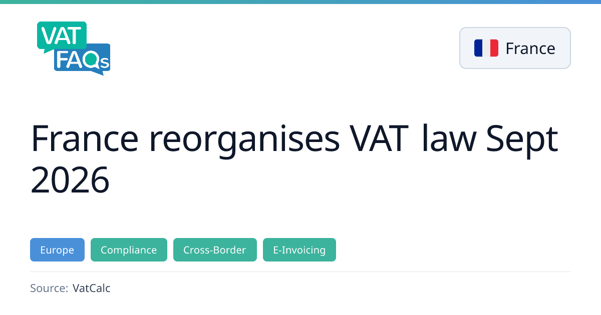 France will transfer all VAT provisions from the General Tax Code into a new consolidated framework, the Code de l’imposition sur les biens et services (CIBS), effective 1 September 2026. The reform modernises the legislative structure, codifies EU measures such as the ViDA package and IOSS, and allows a transition period until 31 December 2027. E‑invoicing rules remain outside the CIBS for the time being.