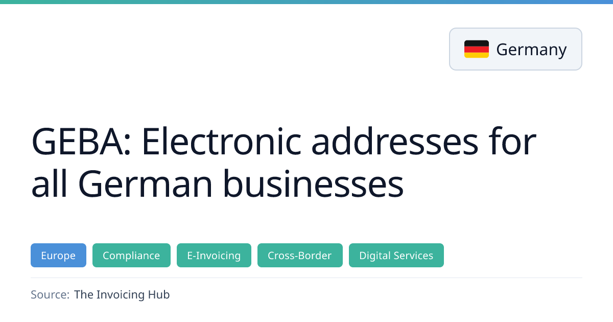 Germany has launched the German Electronic Business Address (GEBA) standard, allowing every business to use a government‑assigned electronic address for Peppol. The GEBA specification, based on the automatically assigned W‑IdNr, is globally interoperable and supports optional sub‑addressing for large enterprises. The rollout is part of Germany’s e‑invoicing roadmap and aligns with upcoming EU e‑invoicing standards.