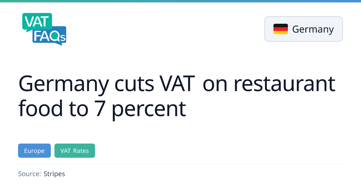Germany has permanently lowered the VAT rate on food served in restaurants, cafes and fast‑food outlets from 19% to 7% effective 1 January 2026, while drinks remain taxed at 19%. Receipts will now show separate VAT lines for food and beverages.