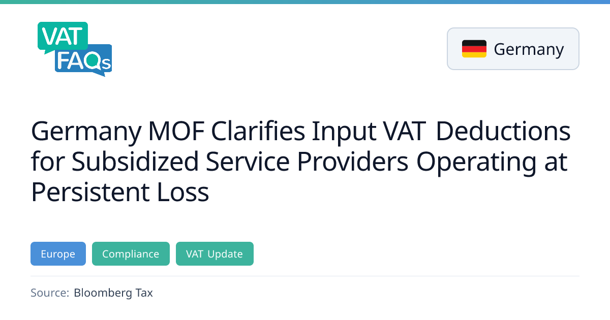 The German Ministry of Finance clarified rules on input VAT deductions for subsidized service providers that operate at persistent loss. The BMF Letter states that such providers cannot deduct input VAT for services unrelated to taxable activity and must satisfy a two‑step test linking remuneration to performance and confirming economic activity. The letter also amends the VAT Application Decree.
