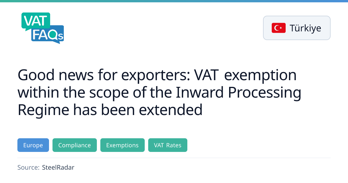 Turkey has extended the VAT exemption for inward processing regime (IPR) purchases until 31 December 2030. The decision, published in the Official Gazette on 29 January 2026, adds five years to the exemption that had been in place for about 27 years. Export‑oriented firms can continue to buy domestically sourced raw materials and intermediate goods without paying VAT, easing cash flow and supporting local supply chains.