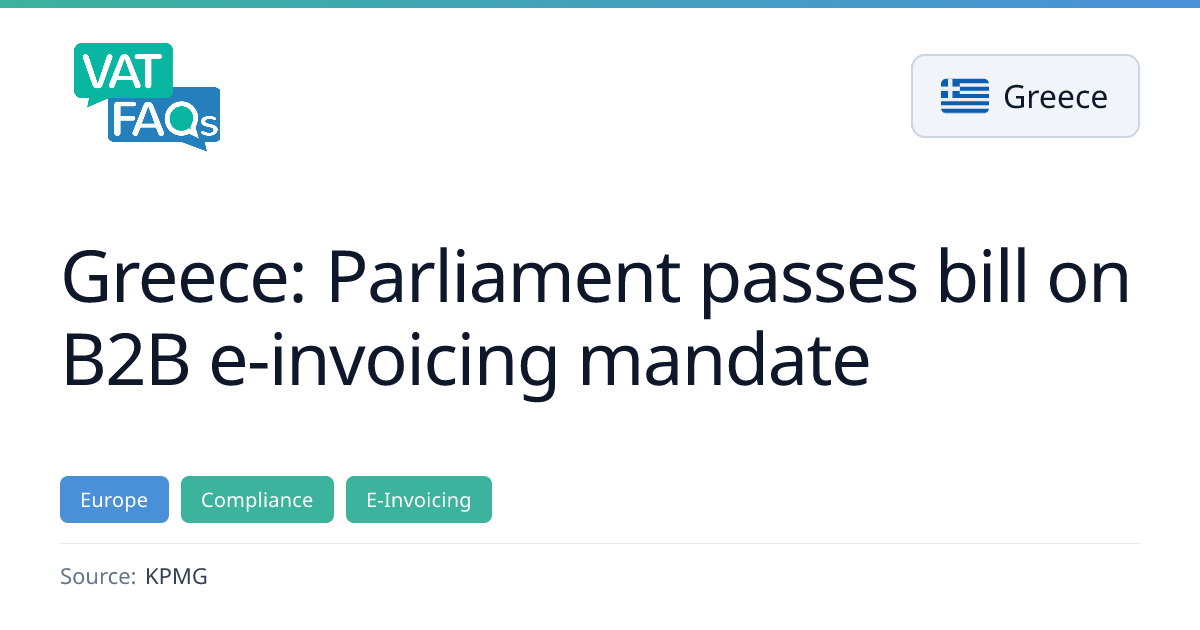 Greece's parliament has passed a bill mandating electronic invoicing for business-to-business transactions, with incentives available for entities that adopt e-invoicing early. The requirement applies to domestic B2B transactions, exports to non-EU destinations, and public contracts.