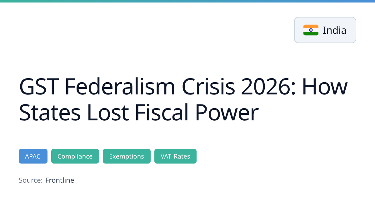 India’s GST, launched in 2017, was intended to unify indirect taxes and balance fiscal power between the Union and States. However, successive rate cuts, the expiration of the compensation guarantee in 2022, and the 2025 three‑tier reform have eroded state revenue, deepening fiscal dependence on the Union.