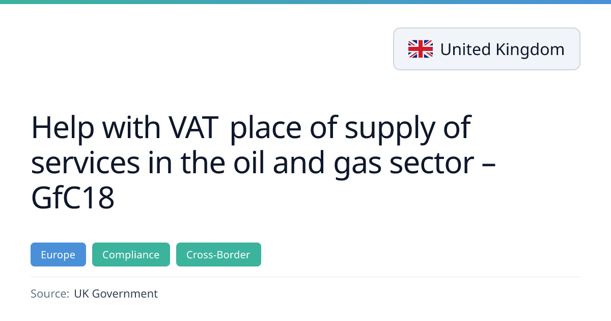 HMRC has released guidance (GfC18) to help businesses in the oil and gas sector determine the VAT place of supply for services. The document outlines special place of supply rules, general rules, fixed establishment rules and other factors that may affect VAT treatment. It is intended to reduce the risk of errors and penalties.